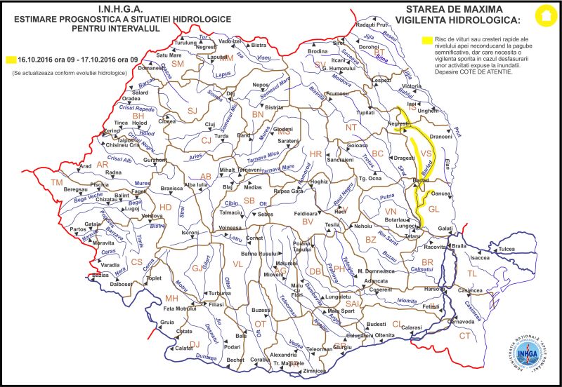 Institutul Naţional de Hidrologie şi Gospodărire a Apelor a emis o atenţionare cod galben de inundaţii în zona Moldovei. „Având în vedere situaţia hidrometeorologică actuală şi prognoza meteorologică pentru următoarele 48 de ore, se pot produce scurgeri importante pe versanţi, torenţi şi pâraie, viituri rapide pe râurile mici cu posibile efecte de inundaţii locale pe unele sectoare de râu şi creşteri de debite şi niveluri pe unele râuri din bazinele hidrografice menţionate, cu posibile depăşiri ale cotelor de atenţie, după cum urmează:În intervalul 16.10.2016, ora 09.00 – 17.10.2016, ora 09.00 pe râurile din bazinele hidrografice: Bârlad şi afluenţi (judeţele Iaşi, Vaslui, Bacău, Neamţ, Vrancea şi Galaţi), afluenţii mici aferenţi cursului mijlociu şi inferior al Siretului din judeţele Neamţ, Bacău şi Vrancea.