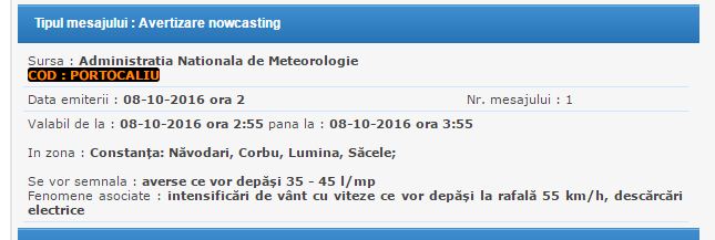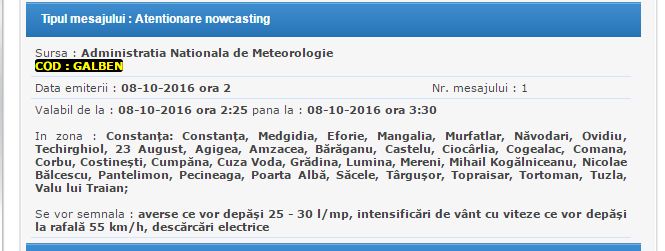 Administrația Naționala de Meteorologie a emis, acum câteva minute, o avertizare tip Cod Galben, valabil, până la ora 03.30, cu posibilitate de prelungire.Sunt afectate Constanța, Medgidia, Eforie, Mangalia, Murfatlar, Năvodari, Ovidiu, Techirghiol, 23 August, Agigea, Amzacea, Bărăganu, Castelu, Ciocârlia, Cogealac, Comana, Corbu, Costinești, Cumpăna, Cuza Voda, Grădina, Lumina, Mereni, Mihail Kogălniceanu, Nicolae Bălcescu, Pantelimon, Pecineaga, Poarta Albă, Săcele, Târgușor, Topraisar, Tortoman, Tuzla, Valu lui Traian.