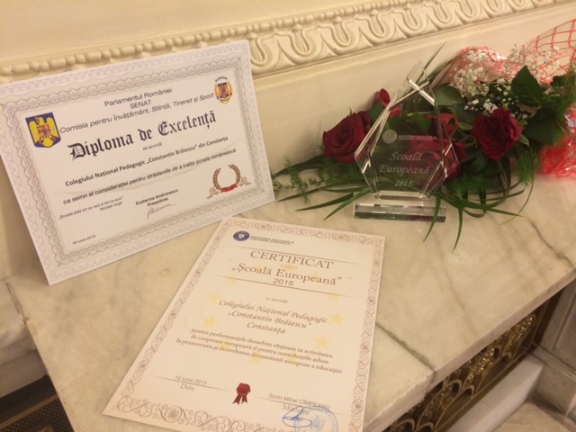 În cadru festiv, delegaţia Colegiului, alcătuită din directorul instituţiei, prof. Anamaria Ciobotaru, responsabilul Departamentului Proiecte, prof. Polixenia Popescu şi preşedintele Consiliului Elevilor, eleva din clasa a XI- a C, Ana Barbu, au primit Diplomă de Excelenţă din partea Comisiei pentru Învăţământ, Ştiinţă, Tineret şi Sport din cadrul Parlamentului României – Senat şi Cerificatul Şcoală Europeană 2015 din partea Ministerului Educaţiei şi Cercetării Ştiinţifice pentru performanţele deosebite obţinute în activităţile de cooperare europeană şi pentru contribuţiile aduse la promovarea şi dezvoltarea dimensiunii europene a educaţiei.