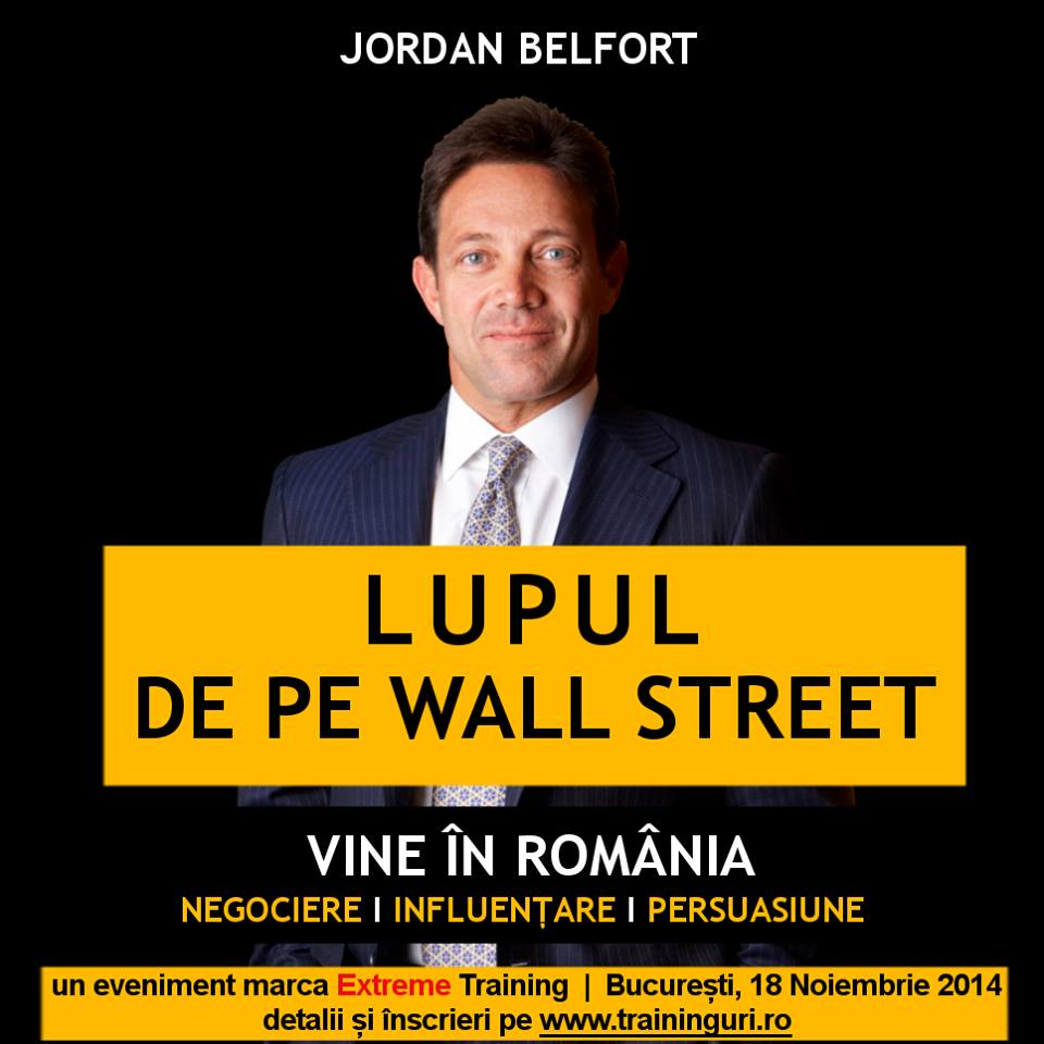 Jordan Belfort, personajul real interpretat de actorul Leonardo di Caprio în filmul nominalizat la Oscar, „Lupul de pe Wall Street”, vine pentru prima dată în România, în data de 18 noiembrie 2014, pentru a susține o conferință, organizată de Extreme Training, în cadrul căreia va dezvălui secretele din spatele succesului său în afaceri, printr-un concept inovator pe care l-a numit „Straight Line Persuasion”.Cei prezenți la conferința organizată la Rin Grand Hotel (Sala Bucureşti), vor avea ocazia să deprindă tehnicile care l-au ajutat pe Jordan Belfort, în anii 1990, să câştige un milion de dolari pe săptămână, transformându-l în „Lupul de pe Wall Street”. Participanţii vor învăţa cele zece trucuri esenţiale pentru creşterea puterii de convingere. Totodată, vor afla şi cum pot utiliza aceste tehnici pentru a se feri de eşecurile cauzate de abordările necorespunzătoare.