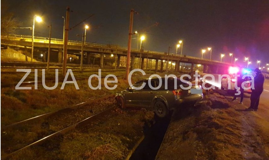 Acolo, un autoturism, cu numere de înmatriculare de Constanţa, care circula pe bulevardul Aurel Vlaicu, a sărit de pe asfalt, direct pe calea ferată.
