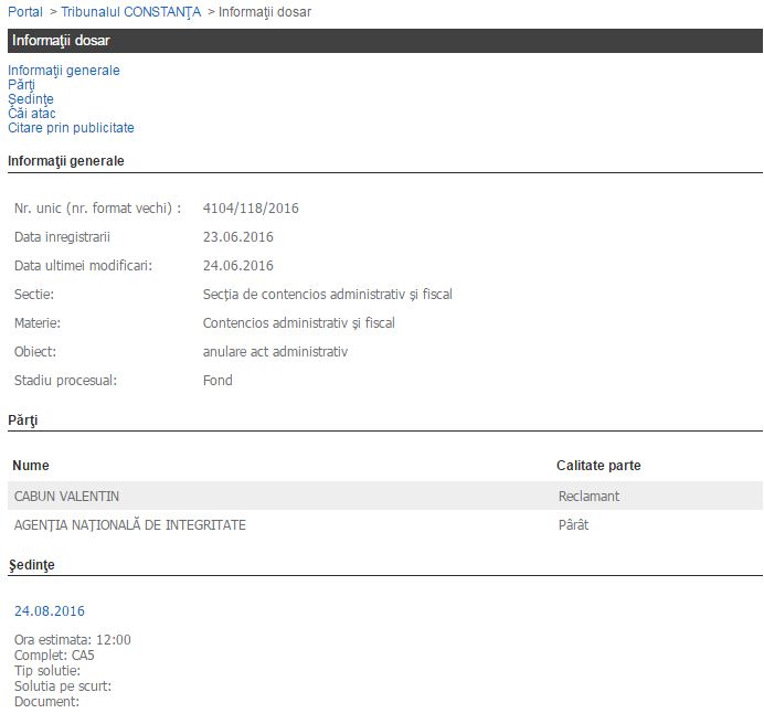 Pe rolul Tribunalului Constanța- Secţia de contencios administrativ şi fiscal, a fost înregistrat dosarul cu număr unic 4104/118/2016, din data de 23.06.2016, având ca obiect anulare act administrativ.Reclamant în cauză este Valentin Căbun, iar pârât Agenția Națională de Integritate.