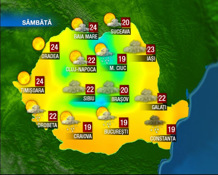 Ploile, îndeosebi cu caracter de aversã, în general slabe cantitativ, însoţite şi de descãrcãri electrice, vor fi mai frecvente în a doua parte a zilei şi seara, pe arii mai extinse în Oltenia, jumãtatea de sud a Banatului şi în cea de vest a Munteniei, zona Carpaţilor Meridionali şi Orientali, centrul şi sudul Moldovei.