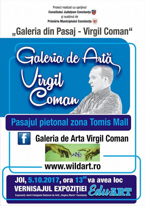 Mâine, 5 octombrie 2017, ora 13.00, va avea loc vernisajul expoziţiei EduArt în pasajul "Galeria de Artă Virgil Coman" de lângă Tomis Mall. Expoziția EduArt simbolizează Ziua Mondială a Educației sărbătorită în întreaga lume pe data de 5 octombrie și reamintește faptul că o educație de calitate reprezintă cheia unei reușite profesionale.Asociația Culturală Wild Art, în cadrul proiectului „Galeria din pasaj-Galeria de Artă Virgil Coman”, a lansat campania culturală „Born to be Wild Art”, o campanie destinată elevilor Colegiului Național de Arte „Regina Maria”, Constanța.