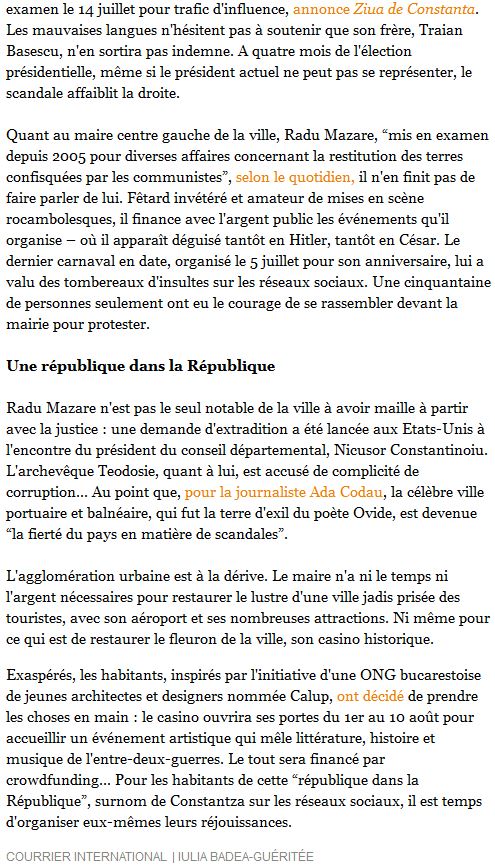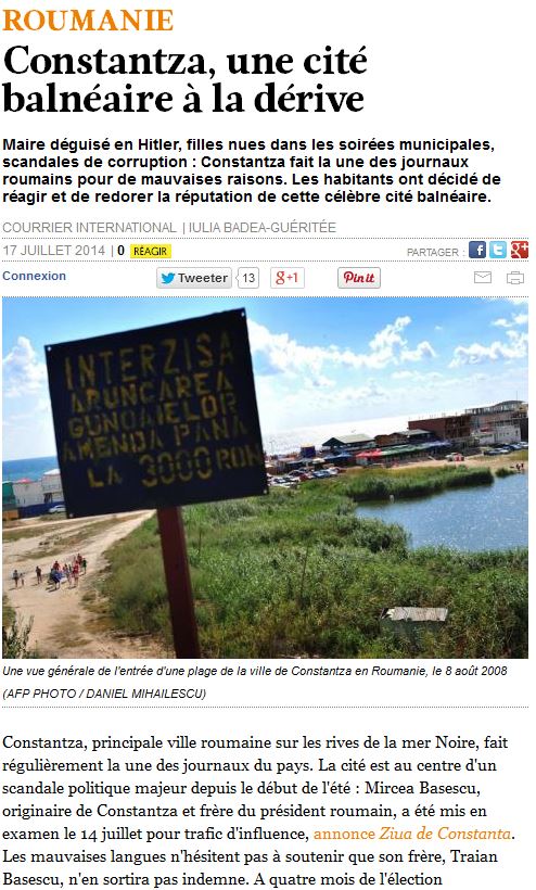 Pueţi citi integral reportajul publicat de cotidianul francez urmând linkul http://www.courrierinternational.com/revue-de-presse/2014/07/17/constantza-une-cite-balneaire-a-la-derive
