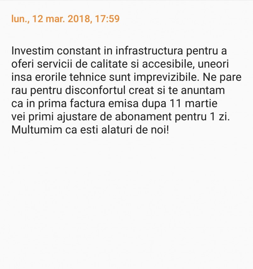 - cici 13 Mar, 2018 13:54 noi la firma nu am putut fi contactati de clienti. avem zilnic comenzi de cca 10000 euro de livrat . in ziua respectiva nu s-a livrat nimic iar a doua zi multe din comenzile intrate online s-au anulat intrucat erau urgente. Ei ne recompenseaza cu o zi de abonament cand noi am pierdut cca 10 000 euro ? e penibil. de luna viitoare iar ne va obliga patronul sa avem cate 2 nre de telefon... abia scapasem de regula cu 2 nre acum o sa revina iar ...