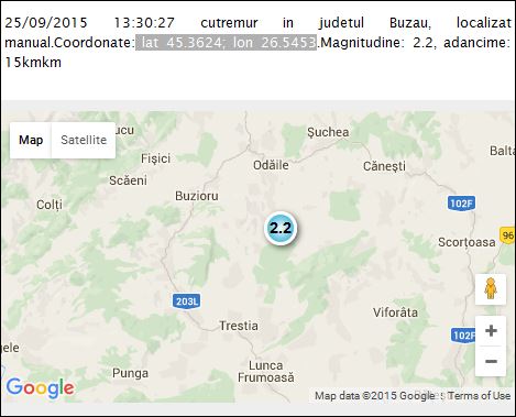 Cutremurul a avut loc la intersecţia coordonatelor lat 45.3624/lon 26.5453, epicentrul fiind localizat între localităţile Buzioru, Odăile, Trestia, Viforâta şi Scorţoasa.