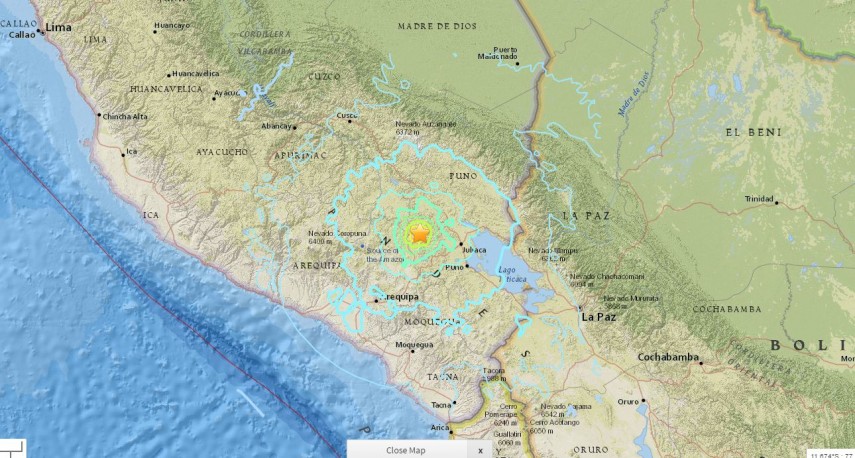 Potrivit usgs.gov, epicentrul a fost localizat la coordonatele 15.28 S/70.70 V la 305 km NV de La Paz, Bolivia, 94 km NV de Puno, și 37 km V de Lampa, ultimele două din Peru.