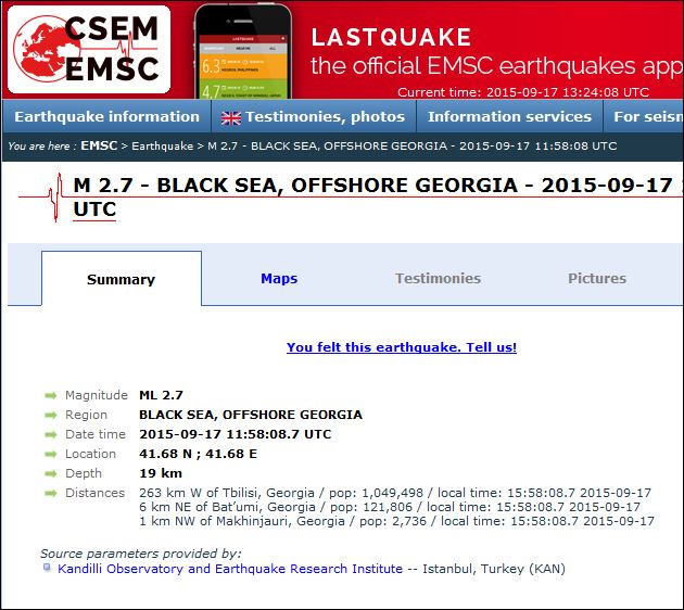 Potrivit Centrului Seismologic Euro-Mediteranean, cutremurul a fost înregistrat în largul Coastelor Georgiei la intersecţia coordonatelor 41.68 N/41.68 E, la 19 kilometri adâncime.