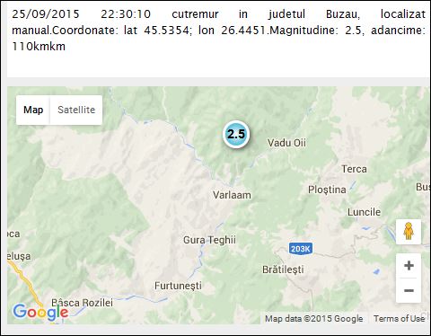 Cutremurul, care s-a produs la ora 22.30, a avut epicentrul la intersecţia coordonatelor lat 45.5354/lon 26.4451 în apropiere de Vadu Oii, judeţul Buzău.