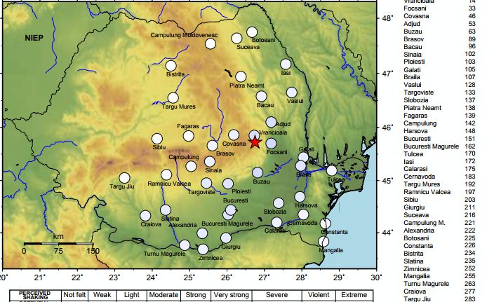 Potrivit Centrului Seismologic Euro-Mediteranean cutremurul a fost localizat la coordonatele 45.72 N ; 26.75 E, la 152 km de București, 34 km de Focşani și 3 km de Nereju.