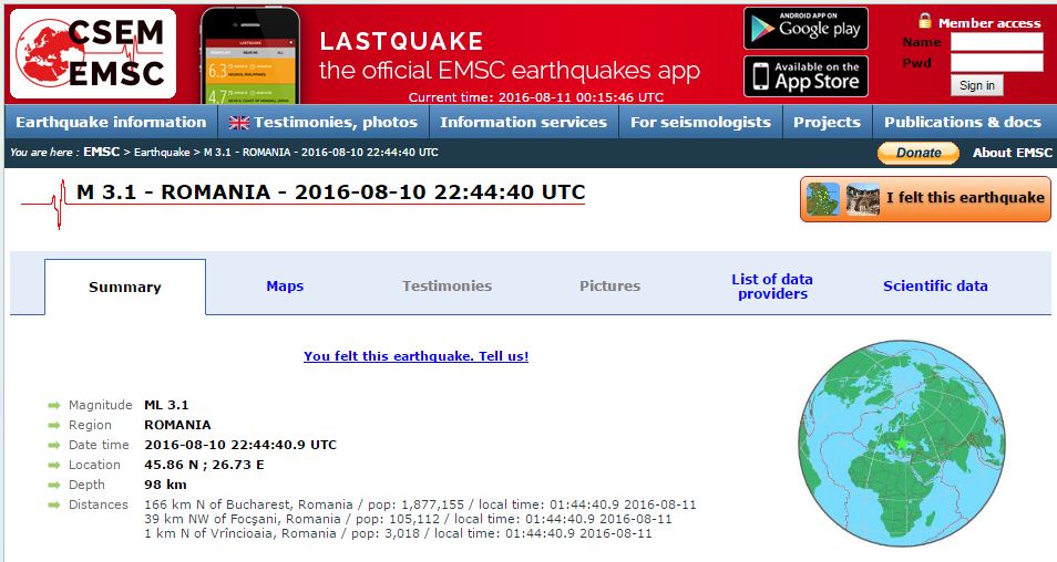 Potrivit Centrului Seismologic Euro-Mediteranean cutremurul a fost înregistrat la coordonatele 45.86 N/26.73 E.