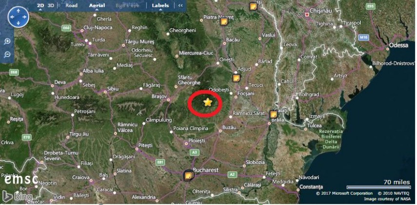 Aceeași sursă mai spune că epicentrul a fost la coordonatele 45.63N/26.52 E la 137 km N de București, 52 km V de Focşani și 16 km V de Jitia.