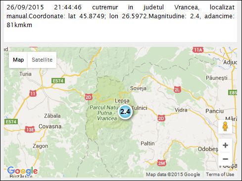 Epicentrul cutremurului a fost localizat în Regiunea Vrancea, zona Lepşa-Tulnici-Parcul Natural Vrancea (45,87 grade latitudine Nordică, 26,59 grade longitudine Estică).
