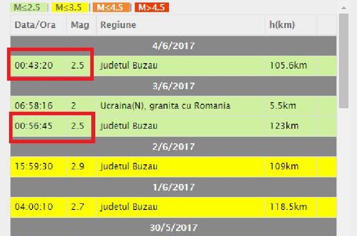Primul a fost înregistrat în noaptea de 3 iunie, la ora 00.56, la 123 kilometri adâncime, la coordonatele lat 45.44; lon 26.40, în zona localităților Varlaam-Gura Șiriului-Nehoiu-Colți.