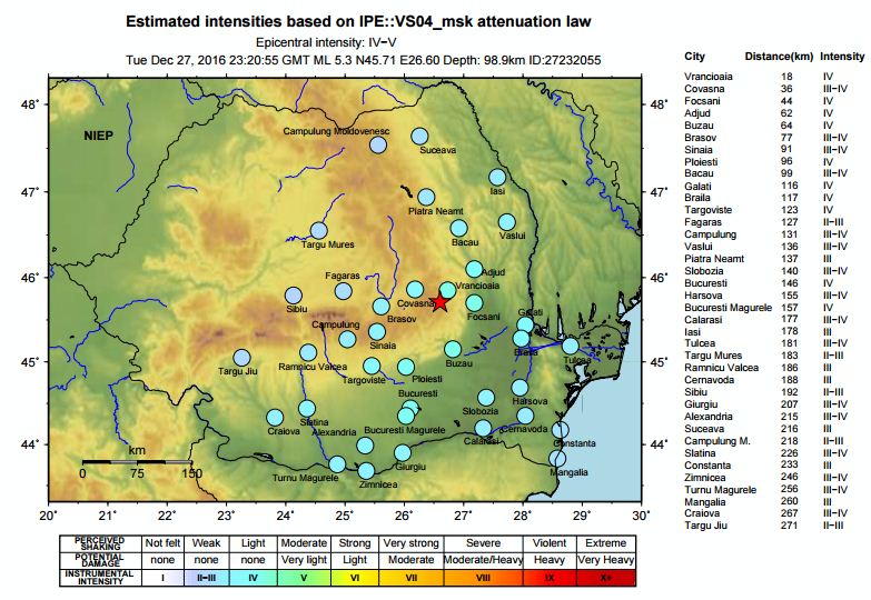 Astfel, un cutremur moderat cu magnitudinea ML 5,3 grade (magnitudine moment Mw 5,6) s-a produs în regiunea Vrancea în noaptea de marți 27 decembrie spre miercuri 28 decembrie.