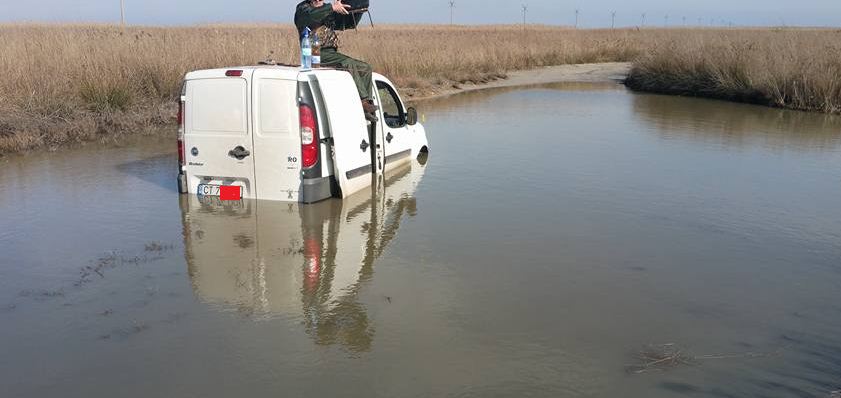 O mașină cu niște pescari a rămas blocată. în Delta Dunării, în zona Istria, pe unul din canalele cele alese de pricepuții în ale știucii și somnului cel mare.