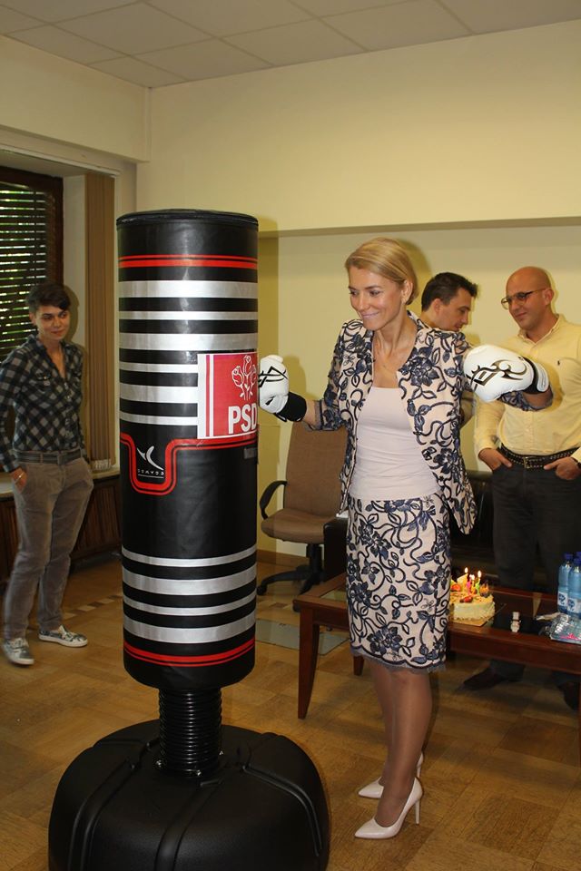 Co-președintele PNL Alina Gorghiu a împlinit 37 de ani azi. Colegii ei liberali au surprins-o cu un cadou… neobişnuit în politica românească! Ei i-au dăruit șefei lor un obiect de… vărsat nervii pe adversarii din PSD. Poza este mai mult decât grăitoare.Gorghiu a primit şi o pereche de mănuși de box, pe lângă sacul de box inscripționat cu un banner al PSD.