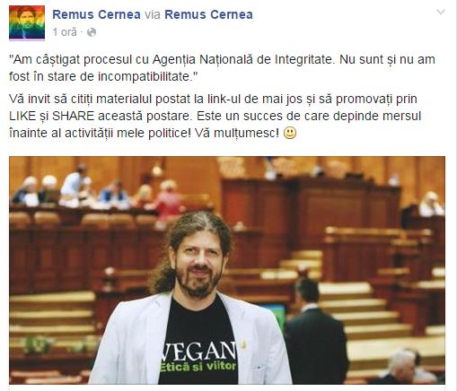 "Am înlăturat, așadar, în instanță, o suspiciune injustă la adresa mea, chiar dacă acest lucru a durat doi ani. Voi continua să fac politică într-un mod curat, numai și numai pentru a promova valorile democratice ale societății deschise, drepturile omului, drepturile animalelor și statul de drept, fără să mă implic în vreun fel în acte de corupție și menținând un standard ridicat de civilitate, integritate și moralitate publică", a declarat Remus Cernea, într-un comunicat de presă.