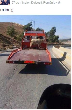 Un berbec, probabil batal, propus a fi sacrificat cine știe pentru ce ritual turcesc sau tătăresc a fost surprins, în urmă cu puțin timp, pe o platformă de transport mașini avariate.