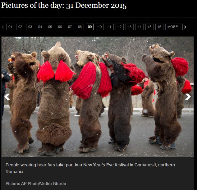 Una reprezintă un colind cu urși suprins în Comănești, cum explică autorul imaginii, în nordul României și este realizată de Vadim Ghirda de la Associated Press Photo, iar cealaltă prezintă altarul improvizat în memoria morților din Club Colectiv, acolo unde au murit 63 de persoane tinere în urma unui incendiu.