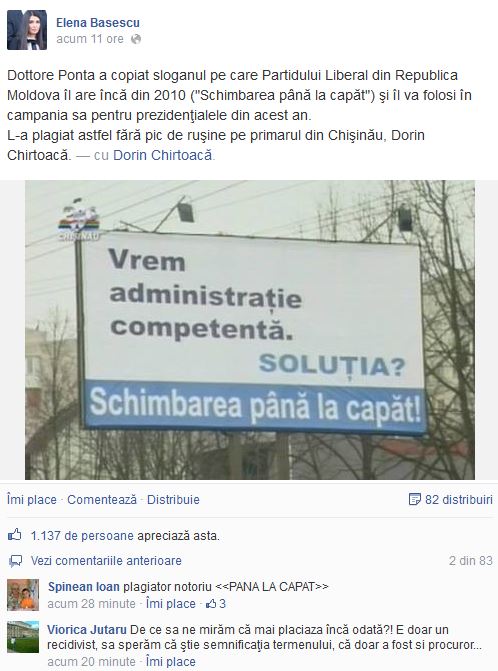 “Dottore Ponta a copiat sloganul pe care Partidului Liberal din Republica Moldova îl are încă din 2010 (“Schimbarea până la capăt”) şi îl va folosi în campania sa pentru prezidenţialele din acest an. L-a plagiat astfel fără pic de ruşine pe primarul din Chişinău, Dorin Chirtoacă”, a scris Elena Băsescu pe Facebook.