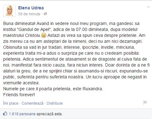 "Buna dimineata! Avand in vedere noul meu program, ma gandesc sa institui "Gandul de Apel", adica de la 07.00 dimineata, dupa modelul maestrului Cristoiu. Astazi as vrea sa spun ceva despre prietenie. Am zis mereu ca nu am asteptari de la nimeni, deci nu am nici dezamagiri. Obisnuita sa vad in jur tradari, interese, ipocrizie, invidie, minciuna, experienta traita mi-a adus o surpriza pe care nu o credeam posibila: prietenia. Adica sentimentul de atasament si de dragoste al cuiva fata de noi, manifestat fara nicio cauza, fara niciun interes. Doar dorinta de a ne fi alaturi la greu, de a ne sprijini chiar si asumandu-si riscuri, expunandu-se public, suferinta pentru suferinta noastra. Un lucru aproape de negasit in vremurile acestea. Numele pe care il poarta prietenia, este Ruxandra. Friends forever!", este mesajul postat de Elena Udrea pe Facebook.