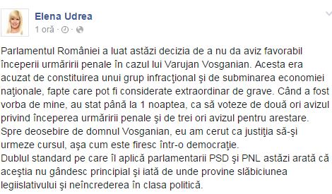 "Parlamentul României a luat astăzi decizia de a nu da aviz favorabil începerii urmăririi penale în cazul lui Varujan Vosganian. Acesta era acuzat de constituirea unui grup infracţional şi de subminarea economiei naţionale, fapte care pot fi considerate extraordinar de grave. Când a fost vorba de mine, au stat până la 1 noaptea, ca să voteze de două ori avizul privind începerea urmăririi penale şi de trei ori avizul pentru arestare”, a scris Elena Udrea.