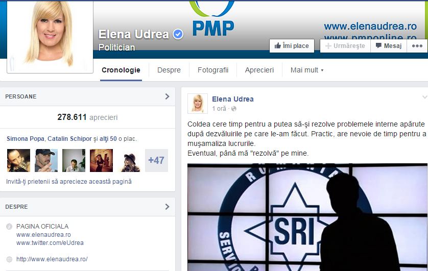 "Coldea cere timp pentru a putea să-şi rezolve problemele interne apărute după dezvăluirile pe care le-am făcut. Practic, are nevoie de timp pentru a muşamaliza lucrurile. Eventual, până mă rezolvă pe mine", a scris Udrea..