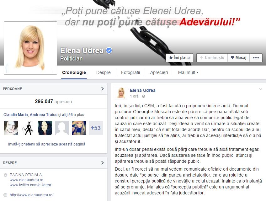 Deci, ar fi corect să nu mai vedem comunicate oficiale ori documente din dosare date "pe surse" din partea anchetatorilor, care au rolul de a construi percepţia publică de vinovăţie a celui acuzat, înainte ca o instanţă să se pronunţe. Mai ales că "percepţia publică" este un argument al acuzării invocat adeseori în faţa judecătorilor", a scris Elena Udrea pe contul de Facebook, în urmă cu aproximativ o oră..