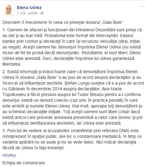 Pe pagina de Facebook a Elenei Udrea a fost postat, în urmă cu o oră, un mesaj semnat de Echipa de comunicare, în care sunt descrise trei mecanisme în ceea ce priveşte dosarul „Gala Bute”.1. Oameni de afaceri şi funcţionari din Ministerul Dezvoltării sunt prinşi că au dat şi au luat mită. Probatoriul este format din interceptări, traseul banilor prin conturi şi declaraţii în care îşi recunosc vinovăţia (deşi, iniţial, au negat). Aceşti oameni fac denunţuri împotriva Elenei Udrea (nu există niciun alt fel de probă decât denunţurile). Rezultanta: ei sunt liberi, Elena Udrea este arestată. Deci, declaraţiile împotriva lui Udrea garantează libertatea.