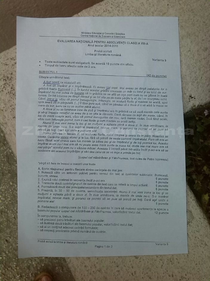 Subiectele de la examenul la Limba şi literatura română au fost structurate pe două mari cerinţe, fiecare cu mai multe sub-puncte. La primul subiect, absolvenţii claselor a VIII-a au avut de redactat o compunere, în care să motiveze apartenenţa la specie a basmului popular “Lupul cel năzdrăvan şi Făt-Frumos”, din care elevilor le-a fost prezentat un fragment, relatează hotnews.ro.