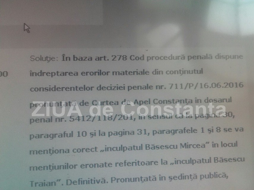 Instanţa a dispus îndreptarea erorilor materiale din conţinutul considerentelor deciziei penale (...) în sensul că se va menţiona corect „inculpatul Mircea Băsescu" în locul menţiunilor eronate referitoare la „inculpatul Băsescu Traian". Decizia Curţii de Apel Constanţa este definitivă.