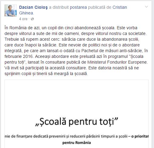 ”În România de azi, un copil din cinci abandonează școala. Este vorba despre viitorul a sute de mii de oameni, despre viitorul nostru ca societate. Trebuie să rupem acest cerc: sărăcia care duce la abandonarea școlii, care duce înapoi la sărăcie. Este nevoie de politici noi și de o abordare integrată, pe care am lansat-o odată cu Pachetul de măsuri anti-sărăcie, în februarie 2016. Aceeași abordare este preluată azi în programul ”Școala pentru toți”, lansat în consultare publică de Ministerul Fondurilor Europene. Vă invit să participați la această consultare. Este datoria noastră să ne sprijinim copiii și tinerii să meargă la școală”, a scris Cioloș pe Facebook.