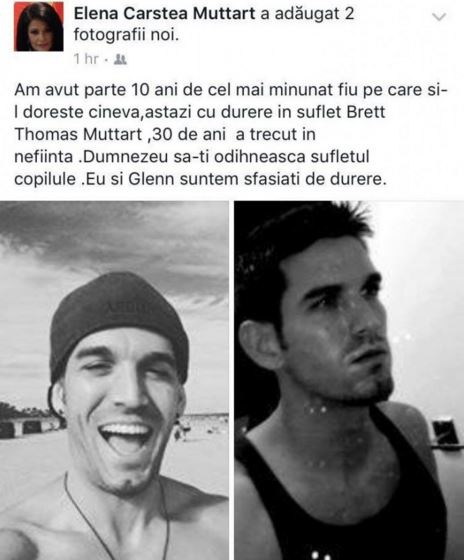 ”Am avut parte 10 ani de cel mai minunat fiu pe care și-l dorește cineva. Astăzi, cu durere în suflet, Brett Thomas Muttart, 30 de ani, a trecut în neființă. Dumnezeu să-ți odihnească sufletul, copilule. Eu și Glenn suntem sfâșiați de durere”, a scris Elena Cârstea.