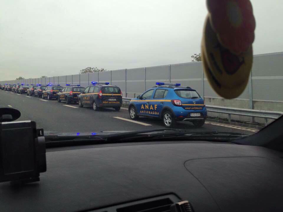 Totul a pornit de la o fotografie postată în urma cu câteva zile pe Facebook. În imagine au fost surprinse zeci de maoini ale ANAF, încolonate pe banda de urgență a unei autostrazi.