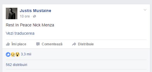 Fostul toboşar al grupului Megadeth, Nick Menza, a murit în timp ce cânta alături de formaţia sa, OHM, un proiect personal. Din primele informaţii, se pare că decesul s-a produs în urma unui atac de cord. Concertul a avut loc la clubul The Baked Potato din Los Angeles.Justis, fiul lui Dave Mustaine - liderul Megadeth - a scris pe pagina lui de Facebook: ”Nick Menza, odihneşte-te în pace“. Menza a înregistrat împreună cu Megadeth albumele “Rust In Peace” (1990), “Countdown To Extinction” (1992), “Youthanasia” (1994) şi “Cryptic.