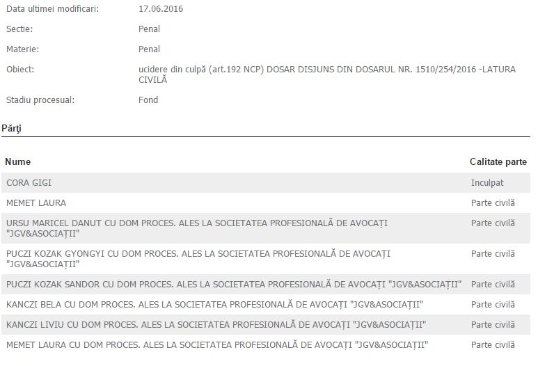 Acum şoferul se duelează, pe partea civilă, la Judecătoria Mangalia cu Memet Laura, Ursu Maricel Dănuţ cu dom proces. ales la Societatea Profesională de avocaţi "JGV&Asociaţii", Puczi Kozak Gyongyi cu dom proces. ales la Societatea Profesională de avocaţi "JGV&Asociaţii", Puczi Kozak Sandor cu dom proces. ales la Societatea Profesională de avocaţi "JGV&Asociaţii", Kanczi Bela cu dom proces. ales la Societatea Profesională de avocaţi "JGV&Asociaţii", Kanczi Liviu cu dom proces. ales la societatea Societatea Profesională de avocaţi "JGV&Asociaţii", Memet Laura cu dom proces. ales la Societatea Profesională de avocaţi "JGV&Asociaţii". Următorul termen este în 14 septembrie a.c.