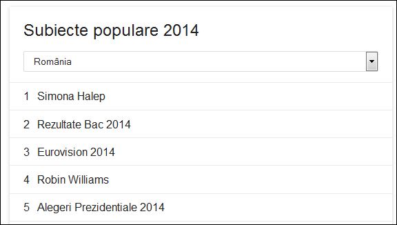 World Cup 2014 - Campionatul Mondial de Fotbal 2014, jocul Flappy Bird, ALS Ice Bucket Challenge şi Philae - robotul aterizor al Agenţiei Spaţiale Europene. În România, topul Subiecte populare 2014 arată astfel: Simona Halep, Rezultate Bac 2014, Eurovision 2014, Robbie Williams şi Alegeri Prezidenţiale 2014.