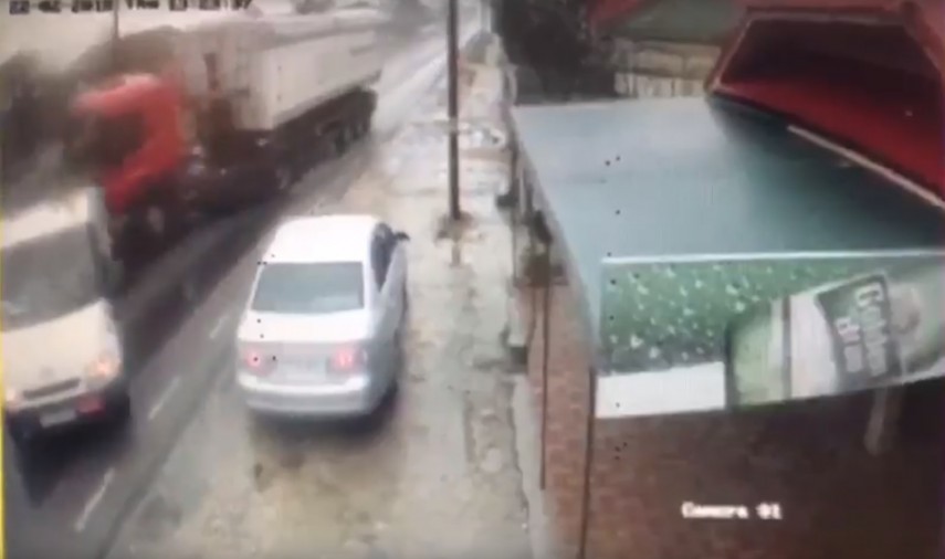 Au apărut imaginile cu accidentul din această după-amiază de pe DN2A, la intrarea în localitatea Crucea din județul Constanța. Vă reamintim că, un TIR s-a răsturnat peste o mașină încărcată cu butelii. În urma impactului autotrenul a rupt gardul unei gospodării și a intrat în curte. Camere video din apropiere au surprins momentul impactului.