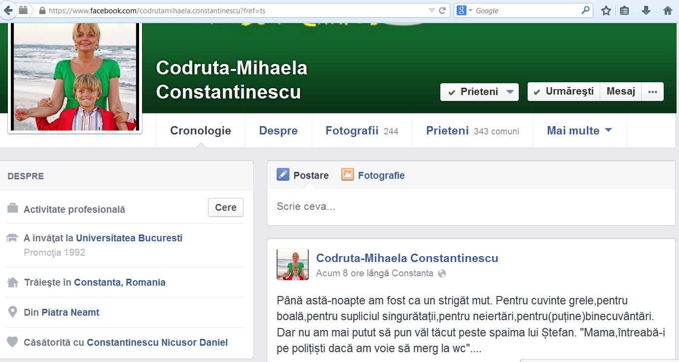 În urmă cu opt ore, Codruța Constantinescu, soția șefului Consiliului Județean Constanța, Nicușor Constantinescu, a lăsat un mesaj emoționant pe contul personal de Facebook. „Până astă-noapte am fost ca un strigăt mut. Pentru cuvinte grele, pentru boală, pentru supliciul singurătații, pentru neiertări, pentru (puține) binecuvântări. Dar nu am mai putut să pun văl tăcut peste spaima lui Ștefan. «Mama, întreabă-i pe polițiști dacă am voie să merg la wc»”, este mesajul lăsat de soția șefului CJC pe pagina de socializare.Amintim că ieri seară la România Tv, Codruța Constantinescu a mărturisit că polițiștii au venit să pună în executare mandatul de arestare emis pe numele soțului său, Nicușor Constantinescu. „Au venit și săptămâna trecută, au constatat că nu este acasă. Au ajuns și-n seara aceasta, după ora 21.00, cu mandatul de arestare preventivă”, a menționat soția lui Nicușor Constantinescu.