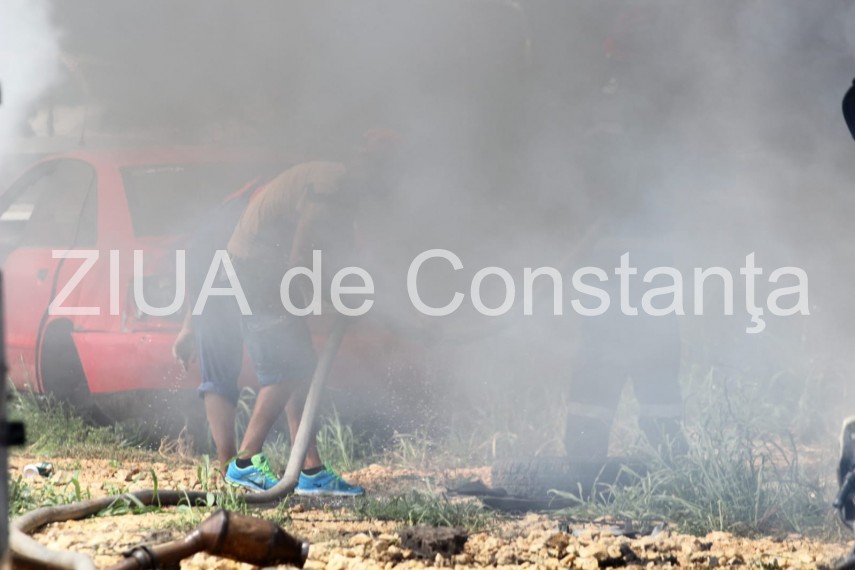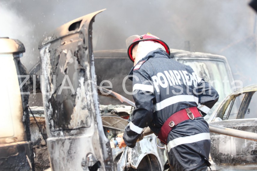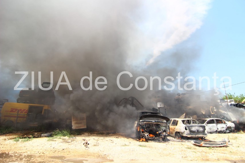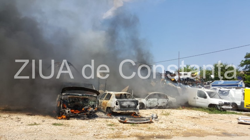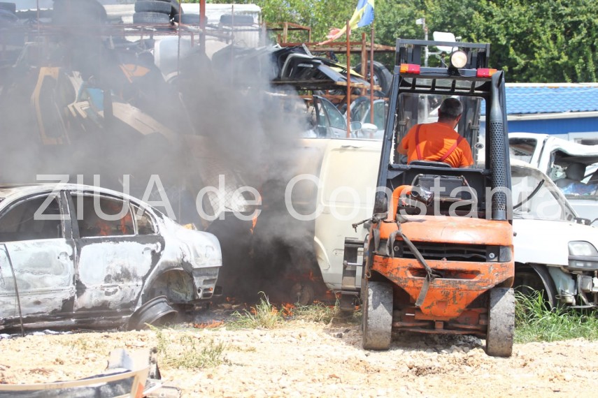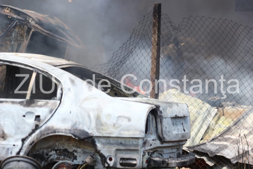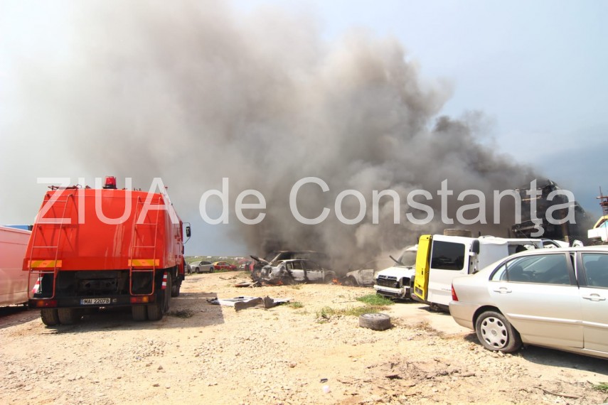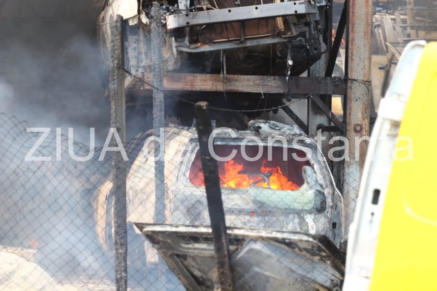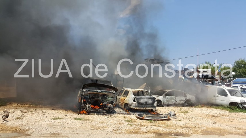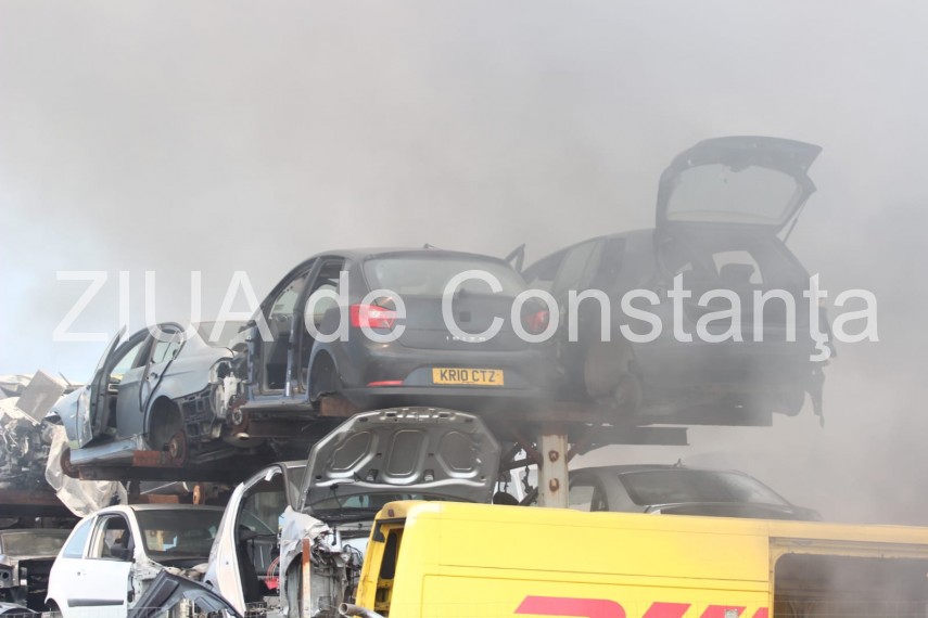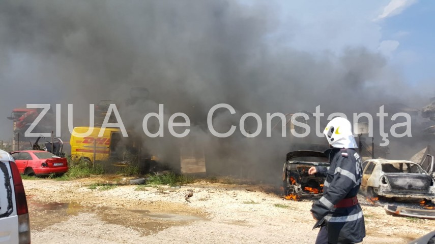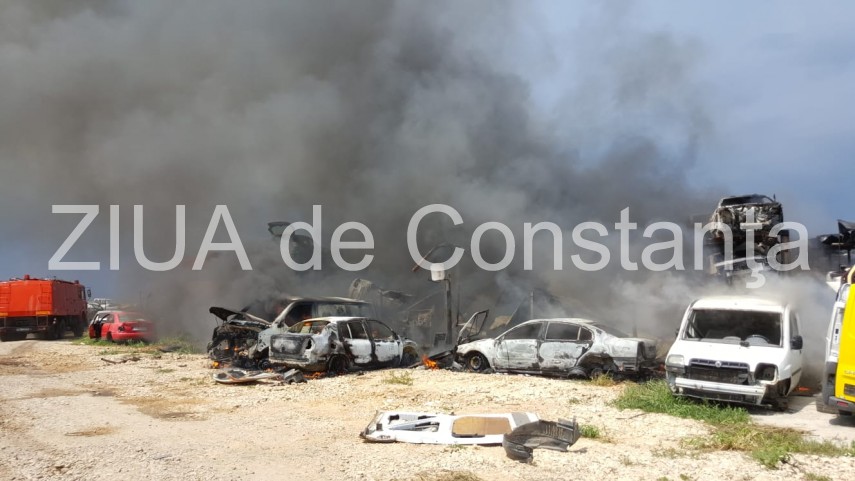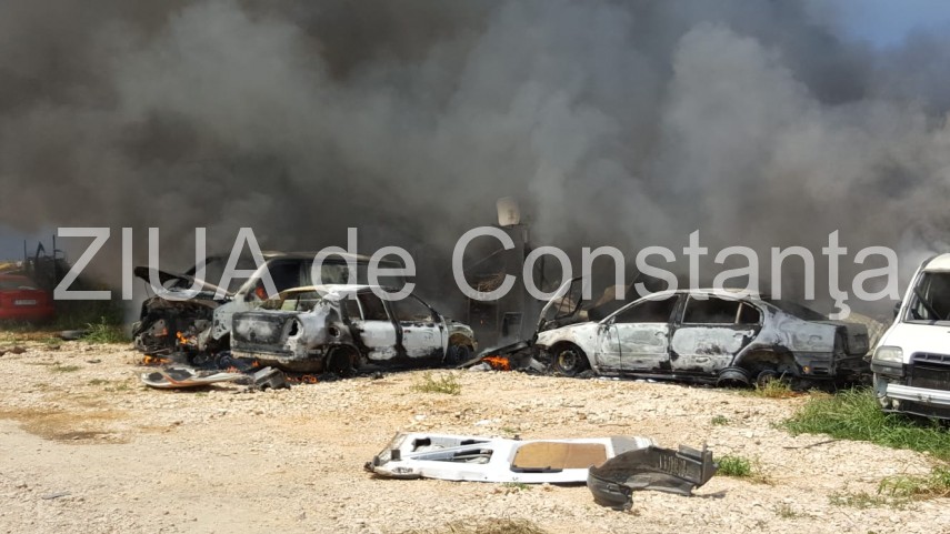 Imagini de la eveniment: Incendiu de amploare la Agigea, la parcul de dezmembrări auto. Ce au salvat pompierii