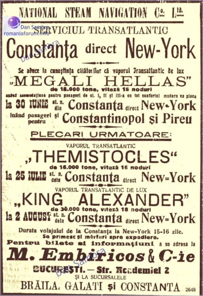 La 1 mai 1914, în cele mai bune perioade ale existenţei Constanţei, fraţii Embiricos inaugurau prima cursă transatlantică dintre Marea Neagră şi New York. Se făcea o escală, obligatorie, la Pireu şi încă una, dacă mai era nevoie, la Marsilia. Au ales vasul „Themistocles”, construit în 1889, de 16 000 de tone şi care putea atinge 16 noduri, adică fix vreo 15 zile de călătorie între Constanţa şi New York. Încă nu erau vize, paşapoartele se eliberau uşor pe la puzderia de consulate străine din vechea cetate a Tomisului şi, să nu uităm, mai erau câteva luni până când omenirea intra în Războiul Mondial. Linia transatlantică a fost marea lovitură a fraţilor Embiricos, la fel de mare precum exportul de cereale şi importul de cărbuni. Până în vara anului 1916, când România a intrat în război, în jur de 5000 de călători cumpărau anual bilete de la National Steam Navigation cu destinaţia New York. Adică, peste 80% dintre pasagerii din Europa de Sud- Est care alegeau să plece în S.U.A. În plus, la cererile Comisiei Europene a Dunării şi a comunităţilor diplomatice şi de afaceri, compania inaugurase, încă din sezonul estival 1911, curse regulate între Sulina şi Constanţa.