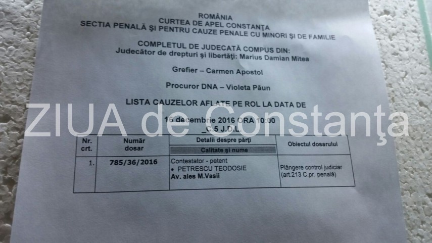 Azi, la Curtea de Apel Constanţa, secţia Penală şi pentru cauze penale, completul de judecată compus din Marius Damian Mitea – judecător de drepturi şi libertăţi, Violeta Paun – procuror DNA, se va judeca solicitarea Arhiepiscopului Tomisului de anulare a controlului judiciar.„Azi avem doar o plângere împotriva măsurii controlului judiciar. Nu avem altfel de argumentaţie decât cea pronunţată iniţial, respectiv faptul că IPS Teodosie nu a săvârşit nicio infracţiune. Ca măsură pevenitvă, controlul judiciar, chiar dacă este considerată o măsură uşoară, totuşi este o măsură grea, care nu se justifică raportată la temeiurile legale. Azi, IPS Teodosie nu s-a prezentat la instanţă, deoarece este la lucrările Sinodului. Lipsa sa este justificată. Vom depune dovezi în acest sens“, a declarat avocata Arhipisopului Tomisului Maria Vasi.