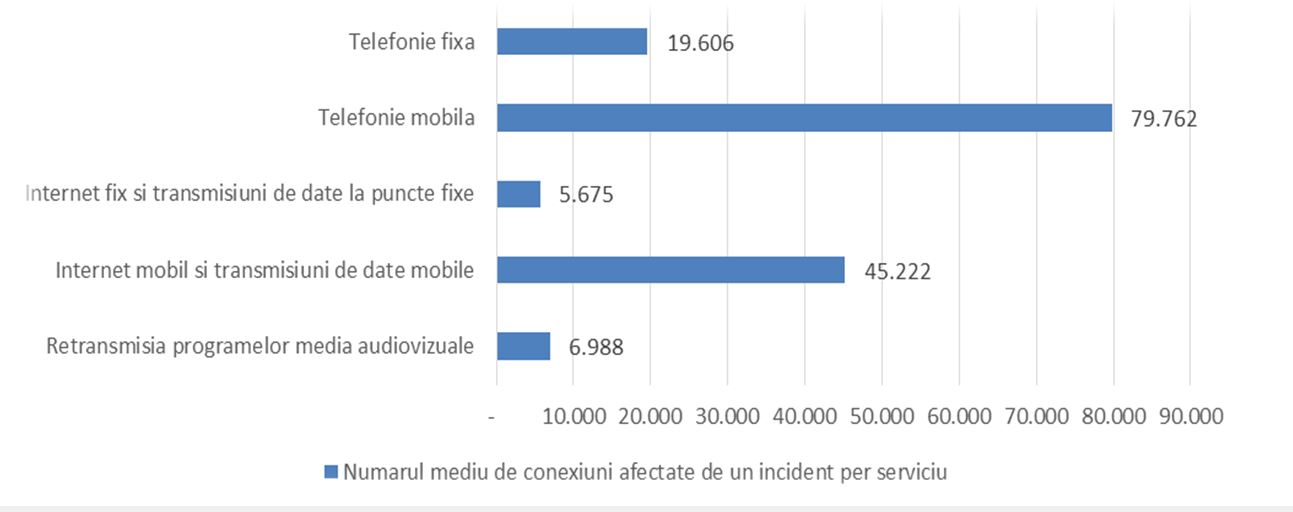 Potrivit datelor raportate de furnizori către ANCOM, un incident cu impact semnificativ a afectat în medie aproximativ 80.000 de conexiuni, iar 80% dintre incidente au fost descoperite în momentul producerii lor. Incidentul mediu a durat 5 ore, în timp ce durata totală a incidentelor raportate pe anul 2013 este de 1.218 ore. Aproape 40% dintre incidente au avut cauze interne furnizorilor de comunicaţii (erori de sistem software sau hardware, erori umane generate de configurarea şi operarea greşită a echipamentelor), majoritatea de peste 60% fiind însă determinate de factori externi (întreruperea alimentării cu energie electrică sau secţionarea accidentală a fibrei optice, fenomene naturale, furturi de cabluri).