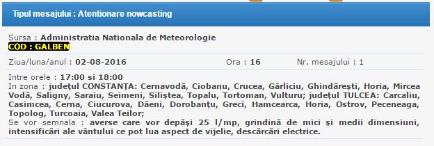 Atenționarea face referire la județul Constanța (localitățile Cernavodă, Crucea, Horia, Mircea Vodă, Rasova, Saligny, Saraiu, Seimeni, Siliștea, Topalu, Tortoman, Vulturu) și județul Tulcea (localitățile Casimcea, Cerna, Dăeni, Dorobanțu, Ostrov, Peceneaga, Topolog, Turcoaia).
