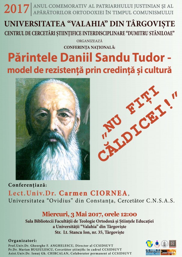 Sala Bibliotecii Facultății de Teologie Ortodoxă și Științele Educației a Universității “Valahia” din Târgovişte (Str. Lt. Stancu Ion, nr. 35, Târgoviște) va găzdui miercuri, 3 mai 2017, de la ora 12:00 Conferinţa Naţională: Părintele Daniil Sandu Tudor – model de rezistență prin credință și cultură" organizată de Centrul de Cercetări Ştiinţifice Interdisciplinare “Dumitru Stăniloae”.Conferențiază Carmen Ciornea, Lector Univ. Dr. la Universitatea „Ovidius” din Constanța și Cercetător C.N.S.A.S.