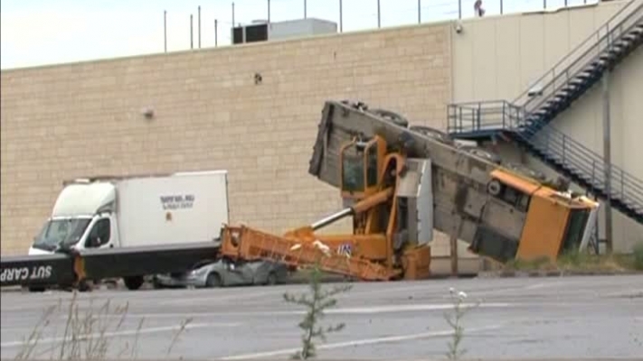 Accidentul s-a petrecut în jurul orei 11.00, în parcarea destinată aprovizionării cu marfă a centrului comercial. Braţul macaralei a distrus complet un autoturism înmatriculat în Bulgaria şi parţial o autoutilitară. Din fericire, nu au existat victime, însă autorităţile au deschis o anchetă pentru a determina modul în care a avut accident. Din primele informaţii se pare că a fost vorba de o manevrare neadecvată a utilajului de mare tonaj.