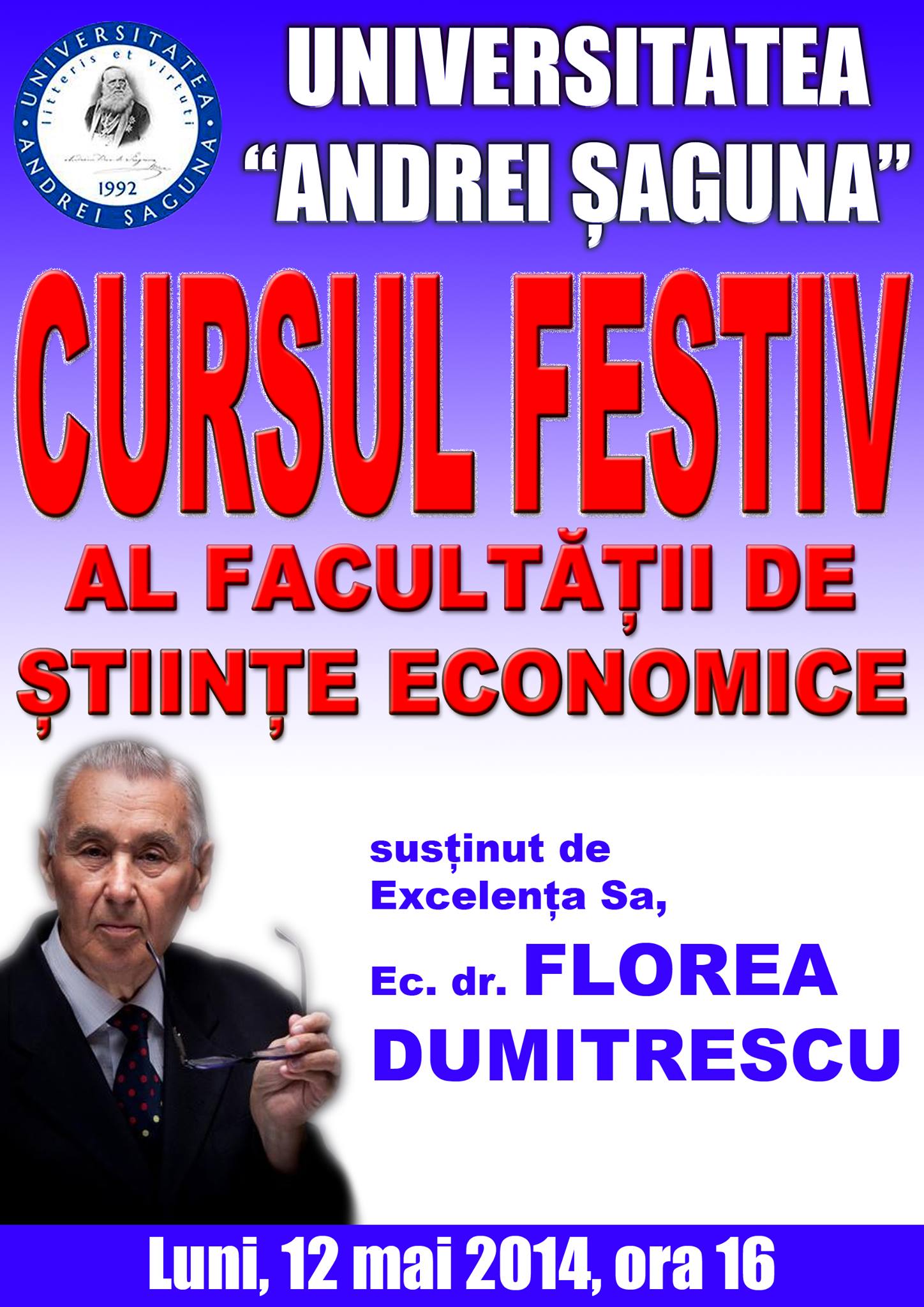 În aceeași zi, la ora 16.00, va fi rândul Facultăţii de Ştiinţe Economice să îşi sărbătorească studenţii şi masteranzii, printr-un curs festiv susţinut de economist dr. Florea Dumitrescu, reputat specialist în probleme economice, financiare şi bancare, o personalitate cunoscută şi apreciată pentru vasta şi valoroasa sa activitate ştiinţifică şi profesională, care a acumulat şi fructificat în beneficiul societăţii o vastă experienţă în domeniu.