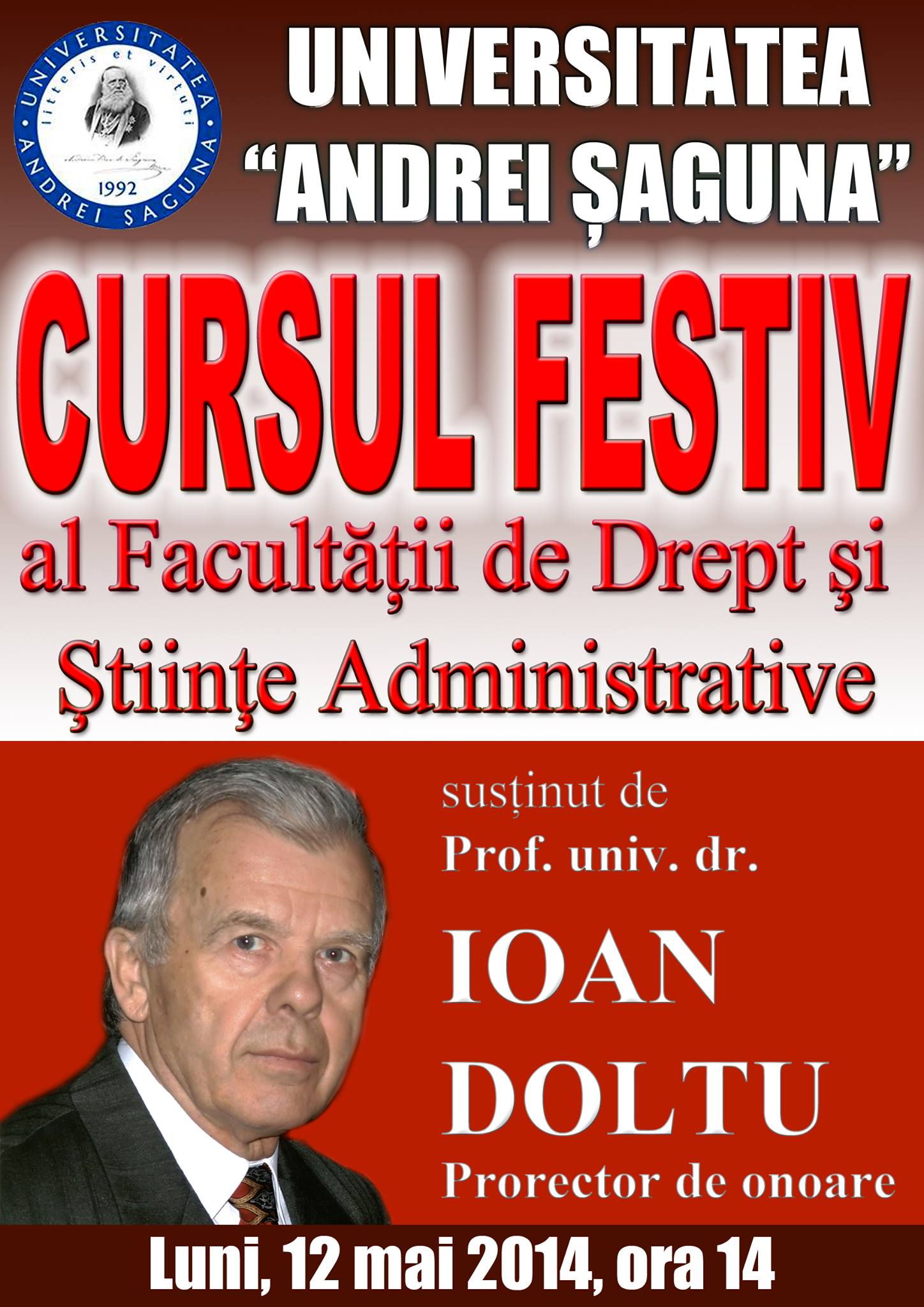 Universitatea „Andrei Şaguna” din Constanţa (UAŞ) începe săptămâna cu două festivităţi importante pentru studenţii şi masteranzii din anii terminali, care sărbătoresc astfel finalizarea studiilor, anunță reprezentanții instituției.Astfel, luni, 12 mai, la ora 14.00, Facultatea de Drept şi Ştiinţe administrative organizează cursul festiv pe care îl va susţine prorectorul de onoare al universităţii, profesor universitar dr. Ioan Doltu, reputat om al legii, cel care se poate lăuda cu o carieră de 40 de ani în magistratură, zece ani în avocatură şi 20 de ani în învăţământul superior, dintre care 15 ani la Universitatea „Andrei Şaguna”, se arată într-un comunicat de presă.